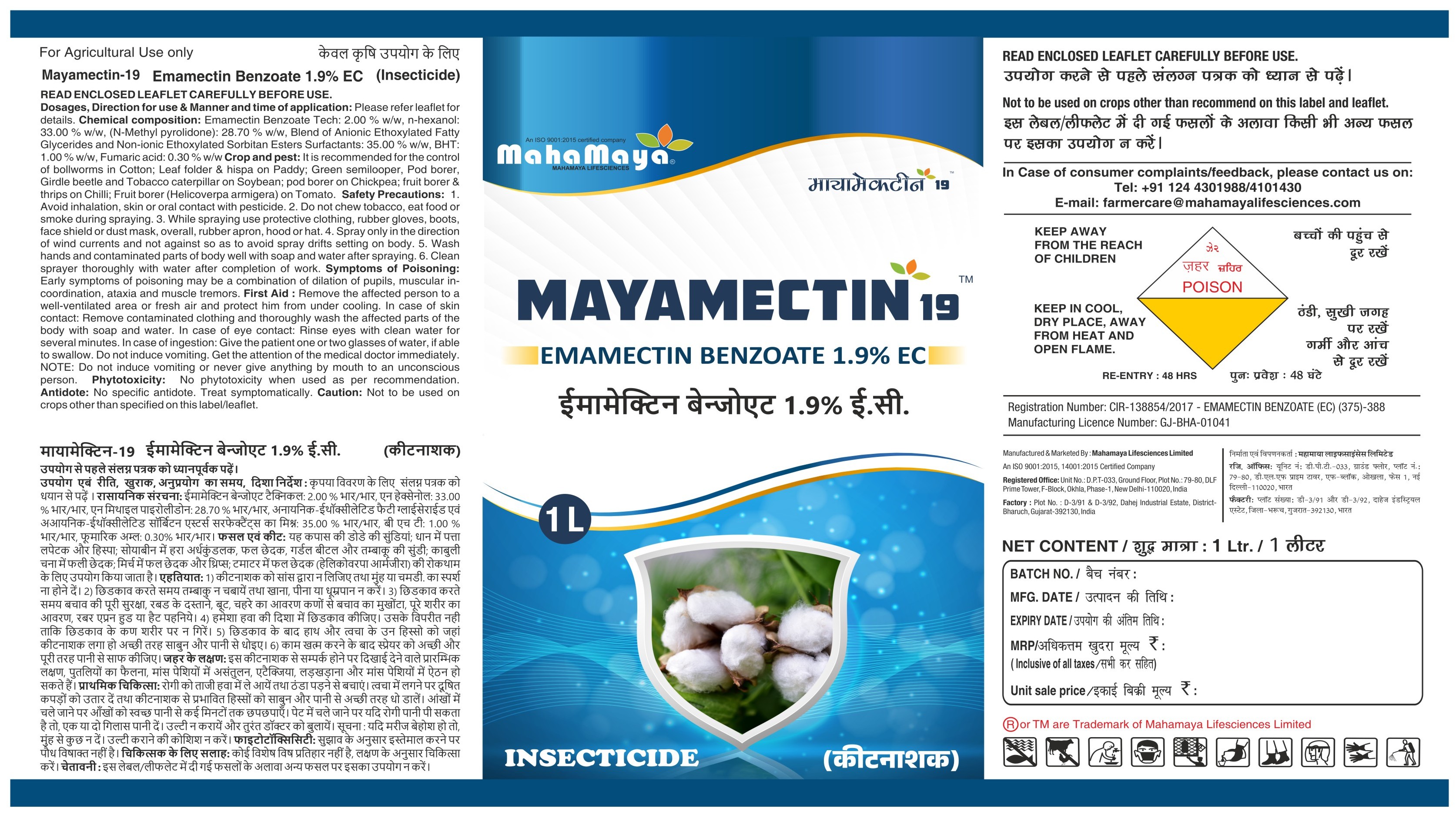 MAYAMECTIN 19™ is a water-soluble liquid formulation containing 1.9% active ingredient and is recommended for the control of bollworms in cotton.