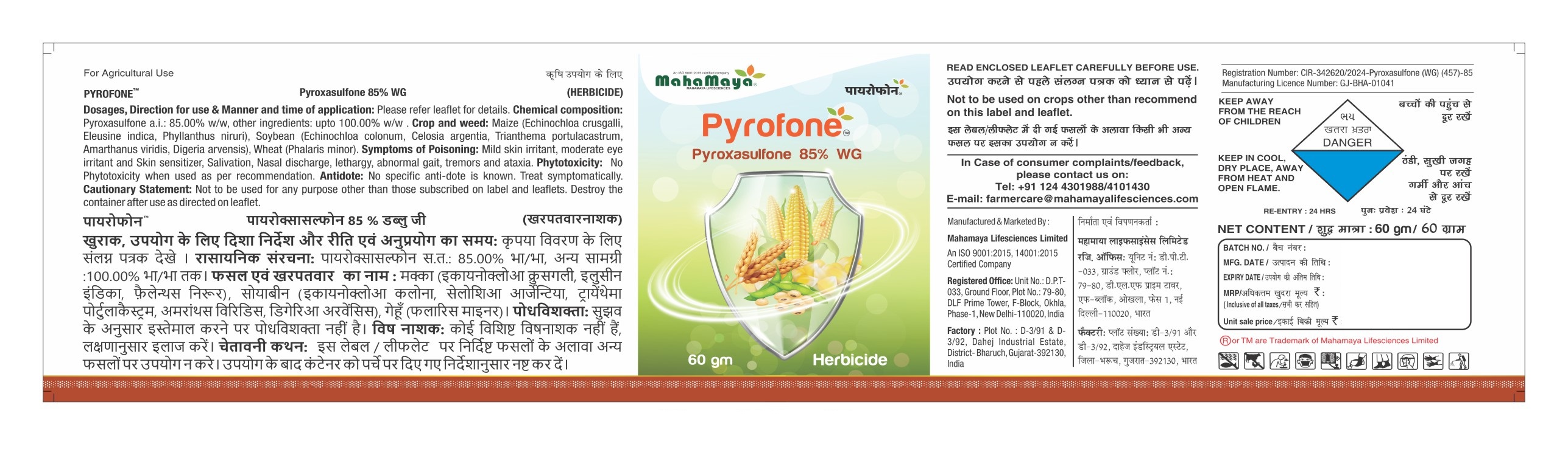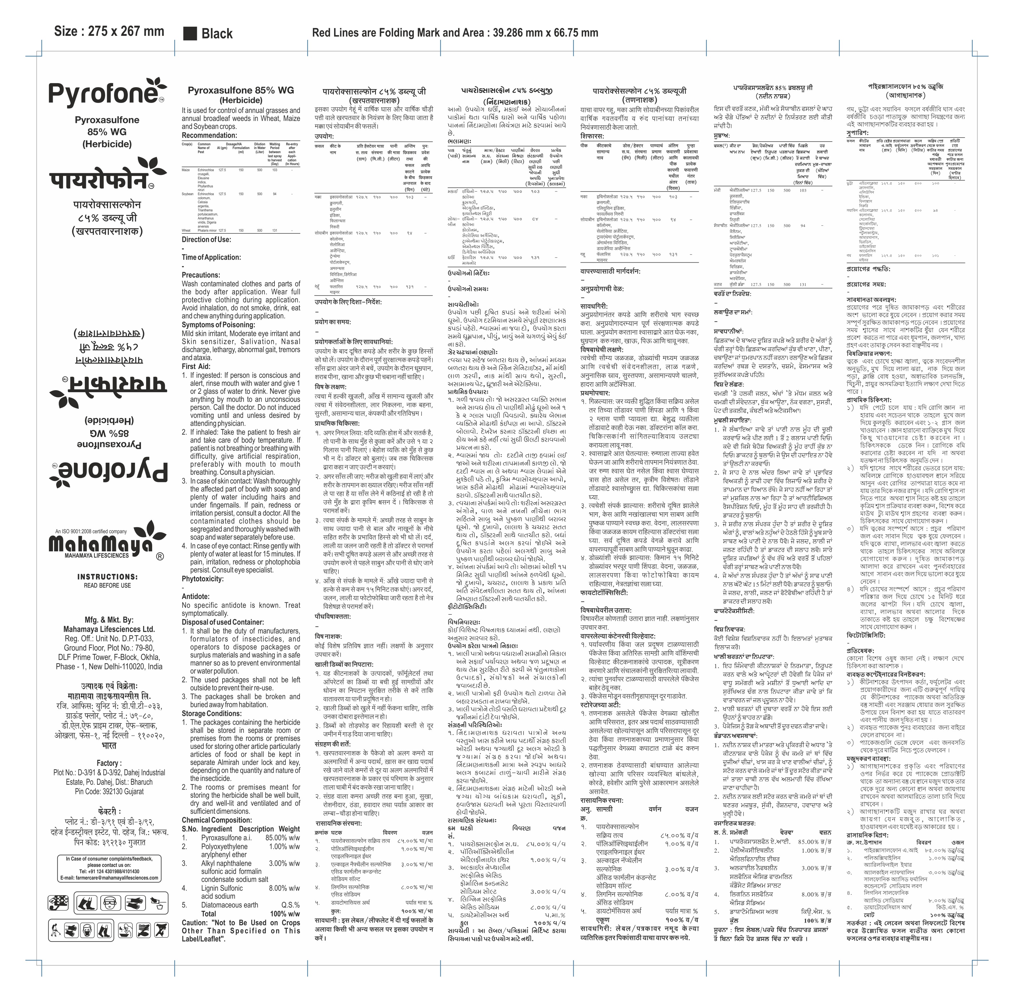 PYROFONE™ is a pre-emergence herbicide containing 85% Pyroxasulfone a.i. used to control annual grasses and broadleaf weeds before they emerge in Wheat, maize and Soybean providing long-lasting, residual weed control.